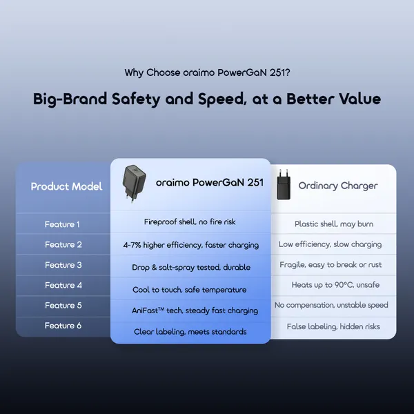 Product Parameters: Model: OCW-5251E Input:180-240V~50/60Hz 0.6A Max Output1(Type-C):5V ⎓3.0A, 9V ⎓2.77A, 12V ⎓2.08A PPS:3.3-11V⎓2.25A Output Power:25.0W Max *oraimo Lab test results