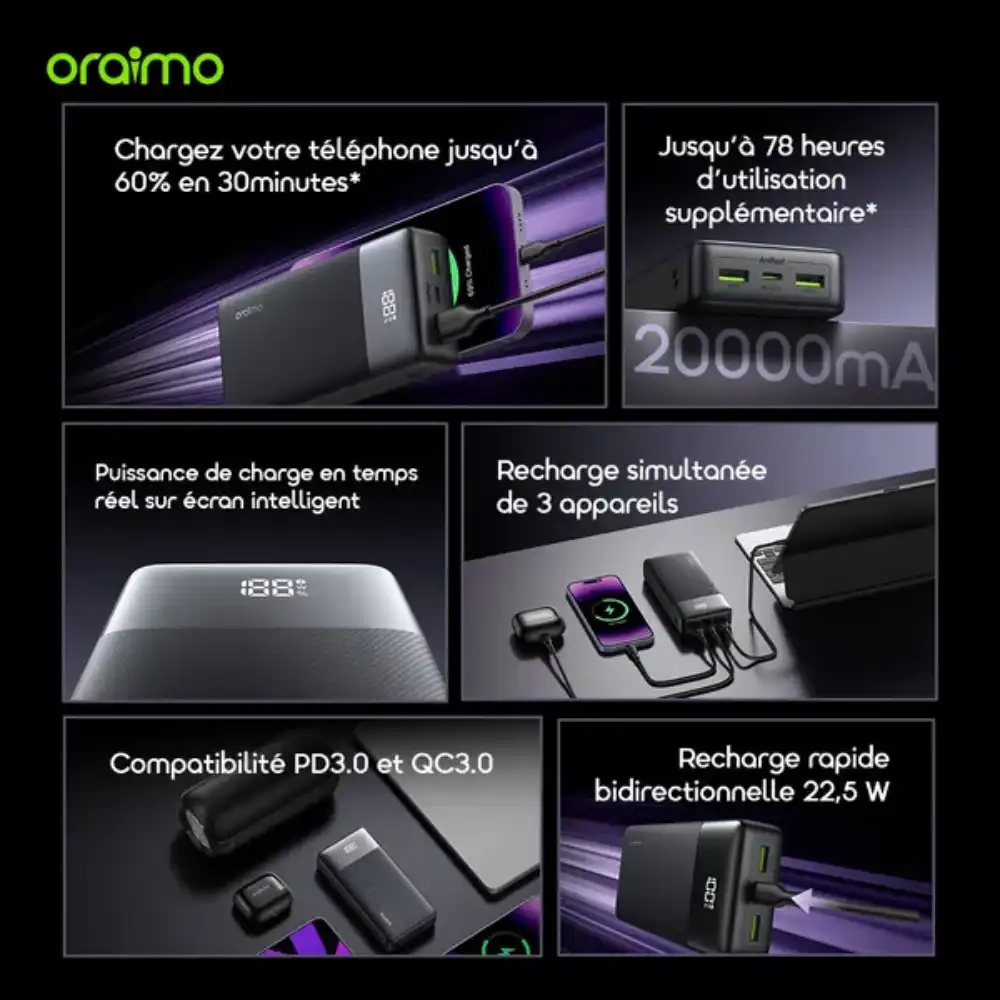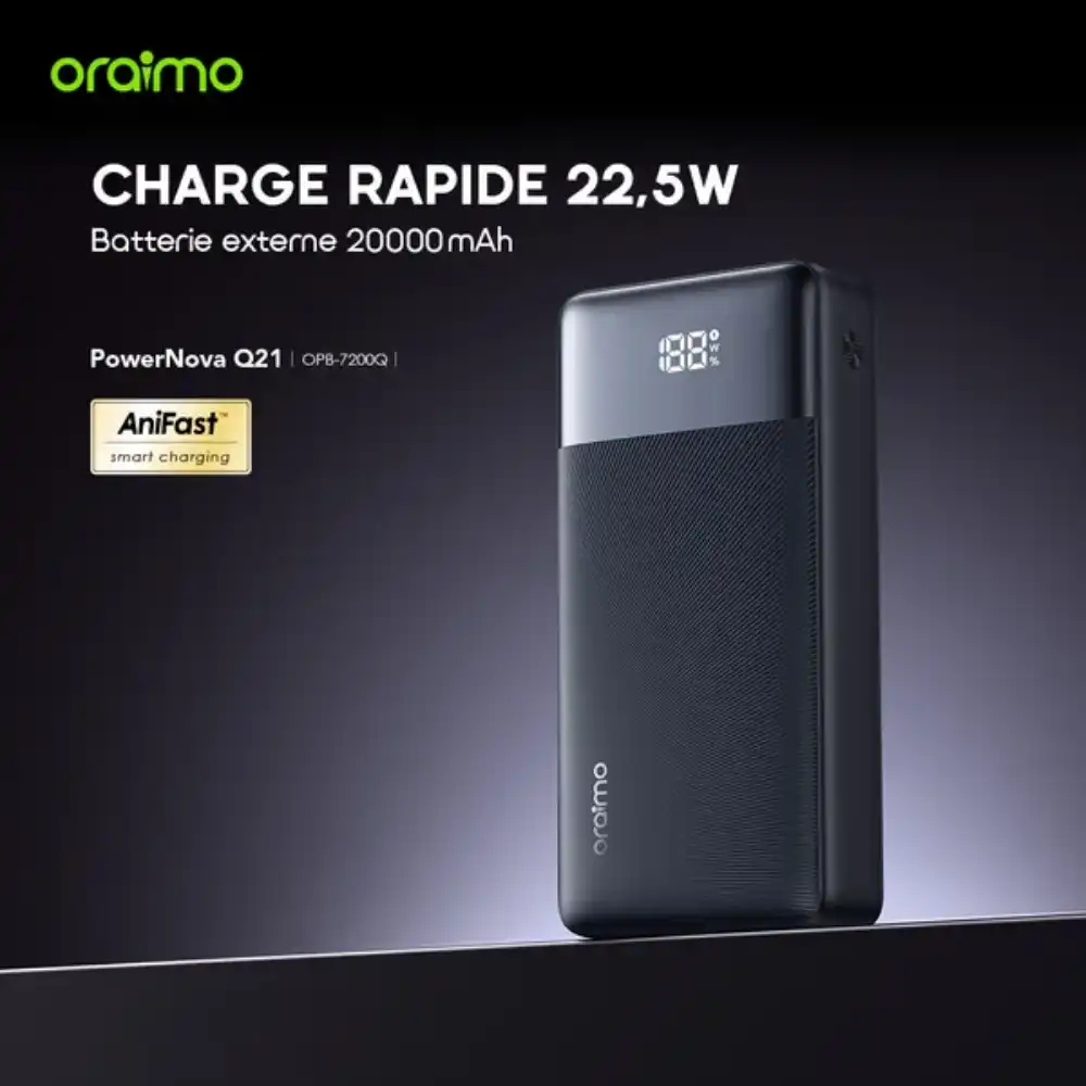 Oraimo PowerNova Q21 OPB-7200Q high-capacity 20,000mAh power bank oraimo PowerNova Q21 OPB-7200Q high-capacity 20,000mAh power bank featuring 22.5W super-fast charging. It is designed to charge devices like an iPhone 15 Pro up to 60% or a Samsung S24 up to 50% in approximately 30 minutes Key Features & Specifications Massive Capacity: 20,000mAh (74Wh) battery, providing up to 96 hours of extra video usage or roughly 4–6 full charges for most smartphones. Super Fast Charging: Delivers a maximum output of 22.5W and supports multiple protocols including PD 3.0, QC 3.0, SCP, and FCP for wide compatibility. Triple Port Output: Equipped with two USB-A ports and one USB-C port, allowing you to charge up to three devices simultaneously. Two-Way Fast Charging: The Type-C port supports a 20W fast input, meaning the power bank itself recharges significantly faster than standard models. Smart Digital Display: Features a clear LED screen that shows the exact battery percentage in real-time. Advanced Safety: Built with a 15-layer smart protection system to prevent overcharging, overheating, and short-circuiting #OraimoPowerNova Q21 OPB-7200Q high-capacity 20,000mAh power bank